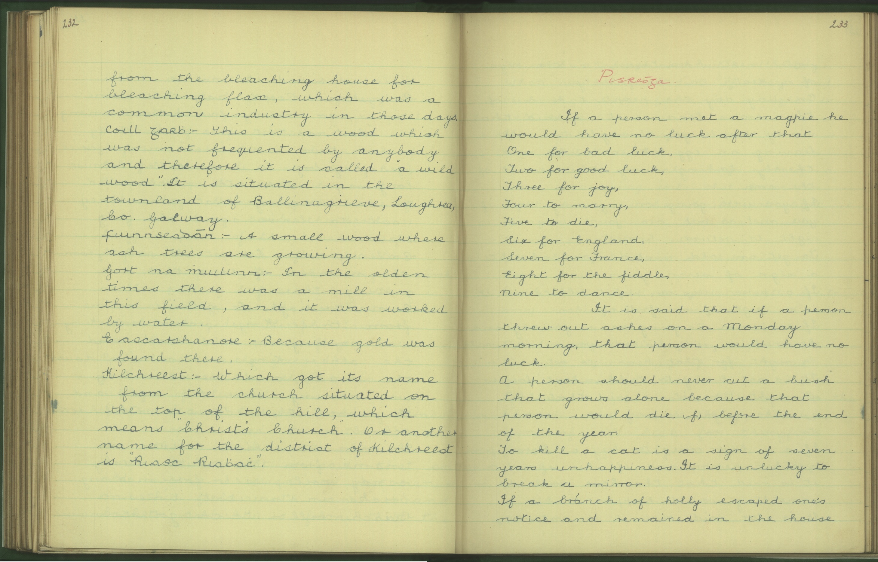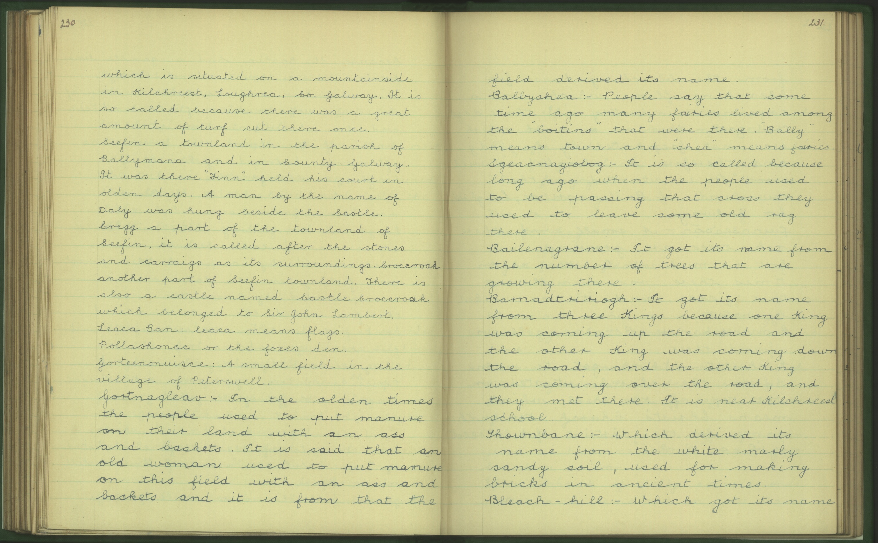 Below is an extract from the Irish Folklore Commission’s Schools Folklore Scheme (1937-38) gathered by school children in the area in 1938. It relates some of the features of the physical and cultural landscape of the area at that time: