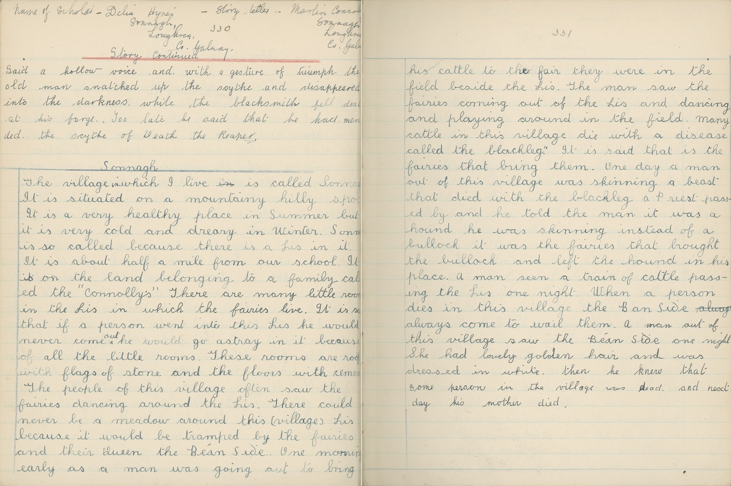Below is an extract from the Irish Folklore Commission’s Schools Folklore Scheme (1937-38) gathered by school pupil Delia Hynes in the townland in 1938. It relates some information about the landscape around Sonnagh at the time, being described as ‘healthy in the summer… …dreary in the winter’. This extract also relates some of the pisreogs known by the school children relating to the nearby ringfort.