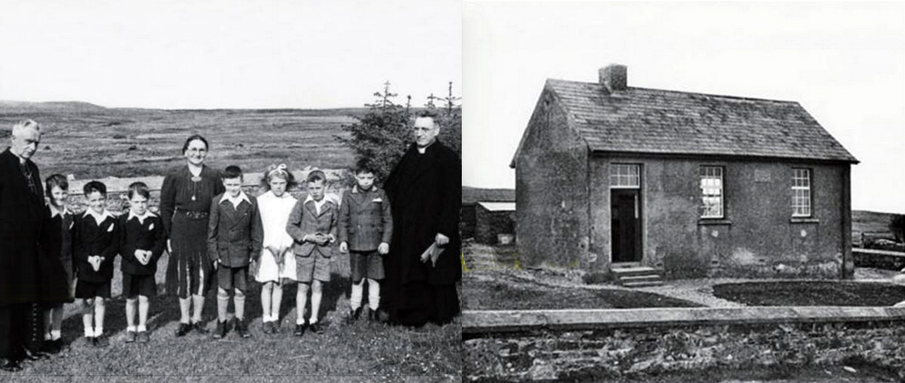 The photographs above show the classroom at Sonnagh NS as it is today. Below are three photographs (courtesy of the Clonfert Diocesan Archives) taken at the school in the early 1940s. They show confirmation candidates in 1943, a view of the school from the outside before the area was planted with coniferous forests, and an internal view of the classroom including the fireplace and schools desks. There is a striking contrast between the bare grazing lands of the Sleive Aughtys in the 1940s, and the forested lands that occur there today.