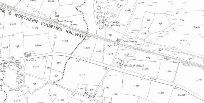 An extract from the First Edition 25-inch Ordnance Survey Sheet showing Brockagh National School at hte turn of the 20th  Century