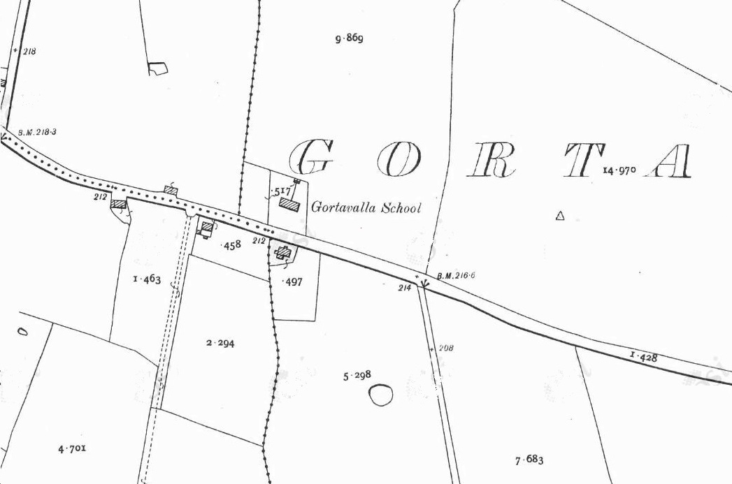 The First Edition 25 inch map (1898-1907) shows that at the turn of the 19thcentury this little hamlet included a smithy, a post office, a terraced street scene, the local church, and a two-roomed school house. Today, no shops, post office or other services remain open here, though to the north side of the R522 are the remains of the disused two-roomed national school built in A.D. 1886.