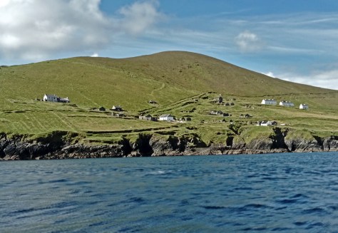The landscape of the Great Blasket Island with the old national school barely recognisable in the centre