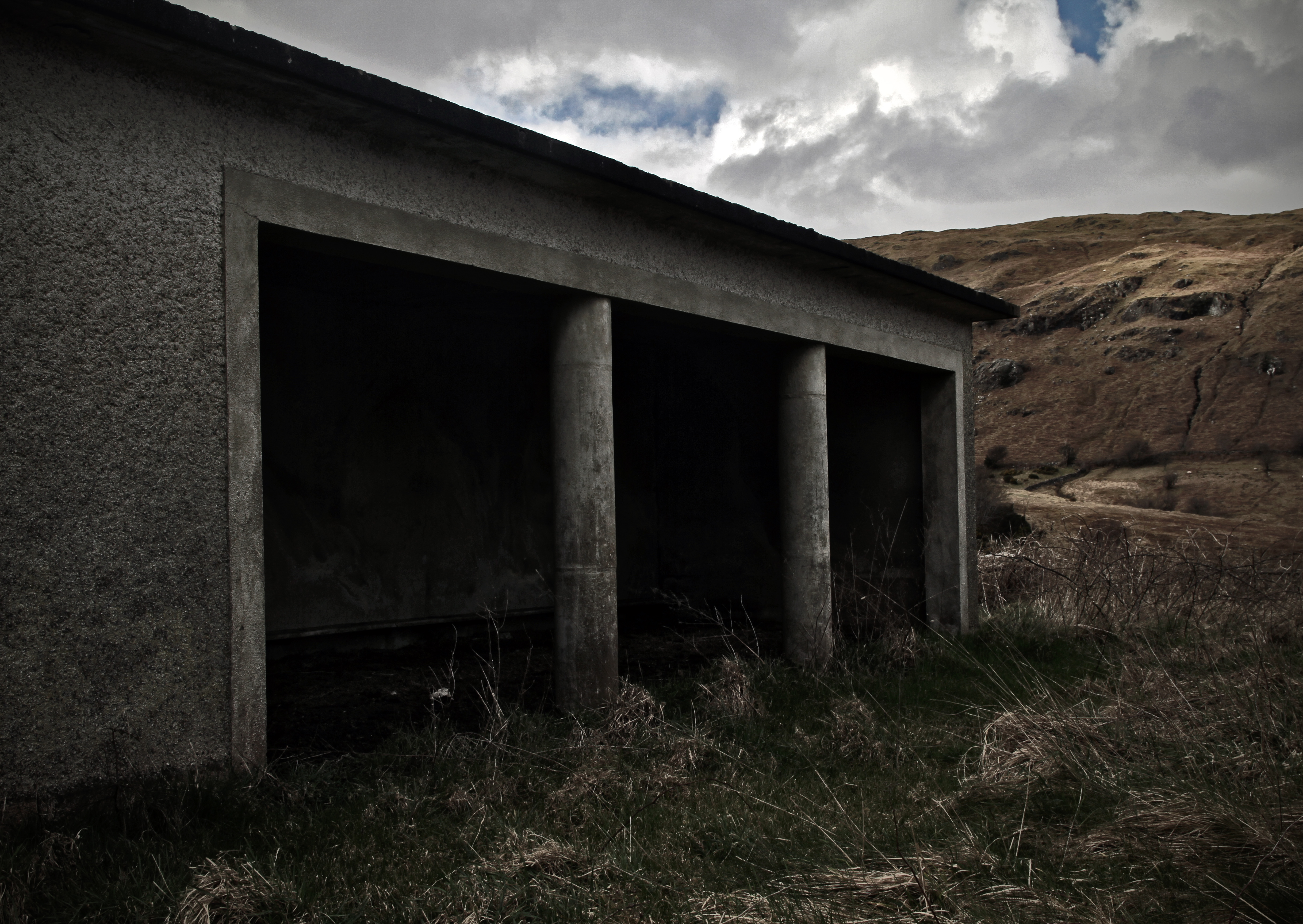 The utilitarian concrete playground shelter of the grassy school yard. Glensaul National School, Greenaun townland, Co. Mayo (c.1950)